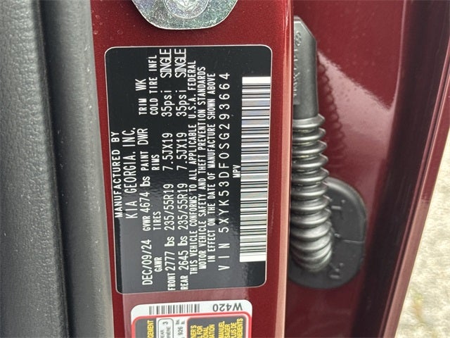 Kia Certified Pre-Owned Certified, 4-Wheel Disc Brakes, 8 Speakers, ABS brakes, Air Conditioning, Alloy wheels, AM/FM radio: SiriusXM, Apple CarPlay & Android Auto, Auto High-beam Headlights, Automatic temperature control, Brake assist, Bumpers: body-color, Carpeted Floor Mats, Compass, Delay-off headlights, Driver door bin, Driver vanity mirror, Dual front impact airbags, Dual front side impact airbags, Electronic Stability Control, Emergency communication system, Four wheel independent suspension, Front anti-roll bar, Front Bucket Seats, Front Center Armrest, Front dual zone A/C, Front fog lights, Front reading lights, Fully automatic headlights, harman/kardon® Speakers, Heated & Ventilated Front Bucket Seats, Heated door mirrors, Heated front seats, Heated steering wheel, Illuminated entry, Leather Shift Knob, Leather steering wheel, Low tire pressure warning, Memory seat, Navigation System, Occupant sensing airbag, Outside temperature display, Overhead airbag, Overhead console, Panic alarm, Passenger door bin, Passenger vanity mirror, Power door mirrors, Power driver seat, Power Liftgate, Power moonroof, Power passenger seat, Power steering, Power windows, Premium Leatherette Seat Trim, Radio: AM/FM/HD Premium Audio System, Rain sensing wipers, Rear anti-roll bar, Rear reading lights, Rear seat center armrest, Rear side impact airbag, Rear window defroster, Rear window wiper, Remote keyless entry, Security system, Speed control, Speed-sensing steering, Split folding rear seat, Spoiler, Steering wheel mounted audio controls, Tachometer, Telescoping steering wheel, Tilt steering wheel, Traction control, Trip computer, Turn signal indicator mirrors, Variably intermittent wipers, Ventilated front seats, Wheels: 19 x 7.5J Gloss Black Alloy.