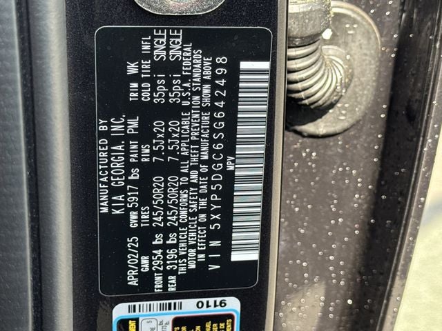 Kia Certified Pre-Owned Certified, 10 Speakers, 3rd row seats: split-bench, 4-Wheel Disc Brakes, ABS brakes, Air Conditioning, Alloy wheels, AM/FM radio: SiriusXM, Apple CarPlay & Android Auto, Auto High-beam Headlights, Auto-dimming Rear-View mirror, Auto-leveling suspension, Automatic temperature control, Brake assist, Bumpers: body-color, Carpeted Floor Mats, Compass, Delay-off headlights, Driver door bin, Driver vanity mirror, Dual front impact airbags, Dual front side impact airbags, Electronic Stability Control, Emergency communication system: 911 Connect, Exterior Parking Camera Rear, Four wheel independent suspension, Front anti-roll bar, Front Bucket Seats, Front Center Armrest, Front dual zone A/C, Front fog lights, Front reading lights, Fully automatic headlights, Garage door transmitter: HomeLink, harman/kardon® Speakers, Heated & Ventilated Front Bucket Seats, Heated door mirrors, Heated front seats, Illuminated entry, Knee airbag, Leather Shift Knob, Leather steering wheel, Low tire pressure warning, Memory seat, Navigation System, Occupant sensing airbag, Outside temperature display, Overhead airbag, Overhead console, Panic alarm, Passenger door bin, Passenger vanity mirror, Power door mirrors, Power driver seat, Power Liftgate, Power moonroof, Power passenger seat, Power steering, Power windows, Radio data system, Radio: AM/FM Harman Kardon Audio System, Rear air conditioning, Rear anti-roll bar, Rear audio controls, Rear reading lights, Rear side impact airbag, Rear window defroster, Rear window wiper, Reclining 3rd row seat, Remote keyless entry, Security system, Speed control, Speed-sensing steering, Split folding rear seat, Spoiler, Steering wheel mounted audio controls, Tachometer, Telescoping steering wheel, Tilt steering wheel, Traction control, Trip computer, Turn signal indicator mirrors, Variably intermittent wipers, Ventilated front seats.